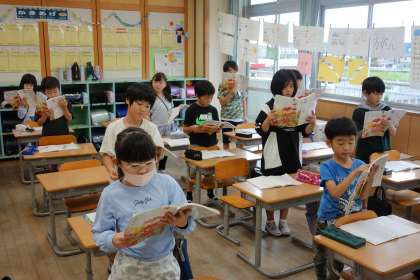国語科の学習の様子です。本文をよく読み、「お手紙」に登場する人物の様子を捉えました。自分の見方や考え方と結び付けながら、意見を交わしました。