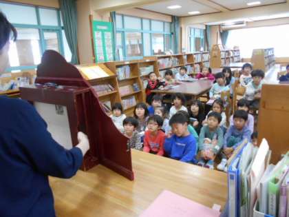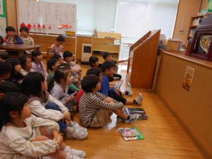 司書の先生にとてもおもしろい紙芝居を紹介してもらいました。引き込まれています。