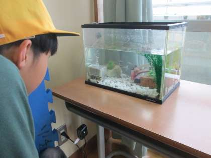 最近、のぞみ級ではメダカを飼い始めました。子供たちは休み時間になる度に水槽を眺めて、可愛がっています。今日は水槽の掃除も頑張りました。
