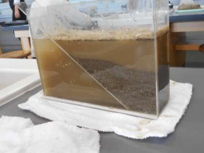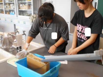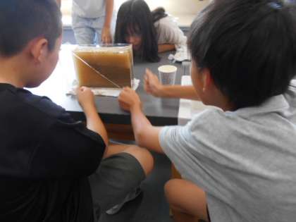 地層のでき方を確認しています。美しい地層をのぞき込んでいます。
