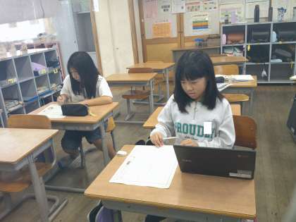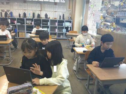 「店ではたらく人」のまとめの学習として、スーパーマーケットの工夫を自分で選んだ方法でまとめる学習をしています。クロムブックを使ってスライドでまとめる方法、新聞でまとめる方法から選び、分からないところは友達と相談したり教え合ったりしながら集中して活動に取り組んでいます。