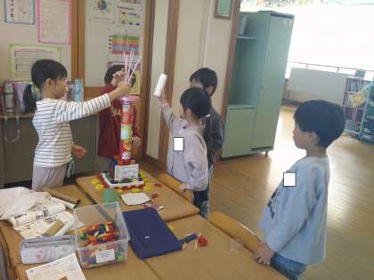 家庭から持ち寄った箱に、学校にあるものを加えて、子供たちは協力してすてきな「もの」を作り上げていました。できあがったときの歓声もすごかったです。保護者の皆様、ご協力ありがとうございました。