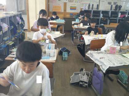 今日は、くぎうちが終わった子供から、作品に色付けをしました。