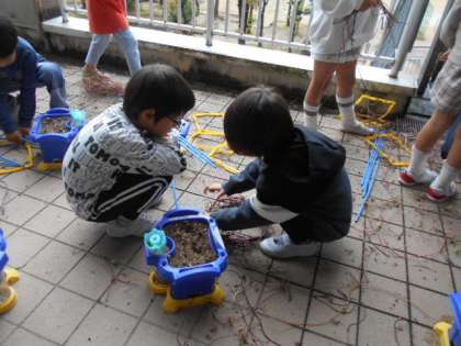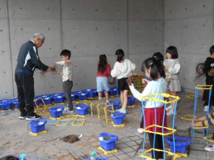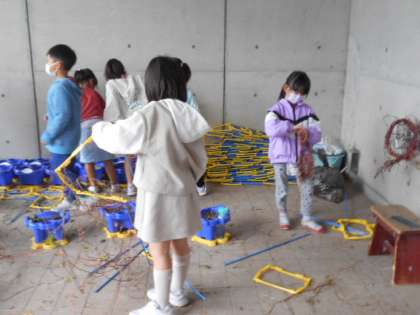 アサガオのつるでリースづくりをします。支柱から丁寧につるを外しています。