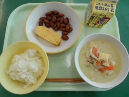 メニューは、ご飯、厚焼き卵、煮豆、ごま豆乳鍋、牛乳でした。