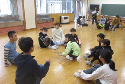 長縄とびの練習について、チームで話し合っています。目標をもってがんばろうとしている5年生です。