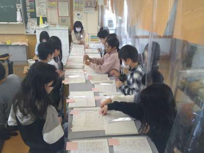 自主学習ノートの取組を互いに見合いました。友達のよいところを認めたり、まねしたりして学び方のレベルを上げていきます。