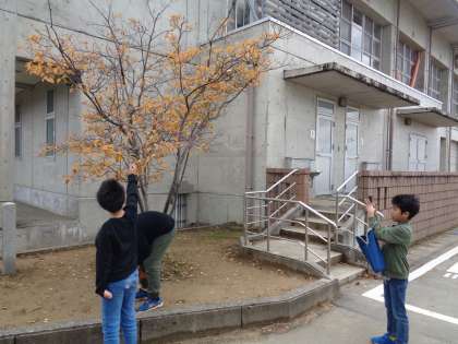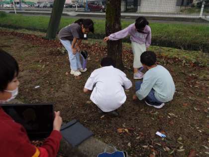 グラウンドの様子を観察しました。木々が紅葉していたり、ドングリが落ちていたりするなど、秋らしい変化に気付いていました。