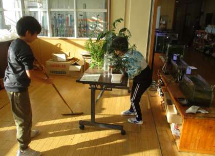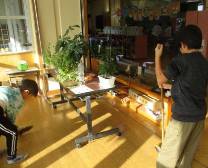 5年生で管理している水槽の周辺をきれいにする子供がいました。