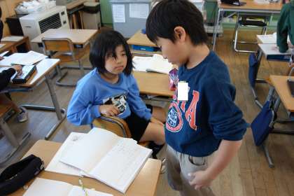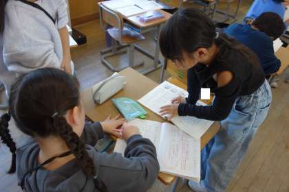国語科の説明文の学習の様子です。紙コップ花火の説明文をよく読み、つくりを確かめました。友達とノートを見せ合い、確かめ合っている様子です。