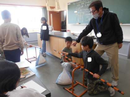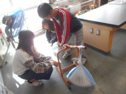 てこの学習です。砂袋の重さは同じですが、重く感じたり、軽く感じたりして、不思議そうでした。