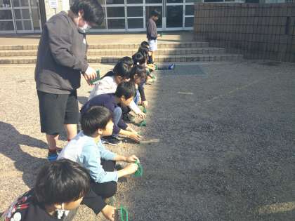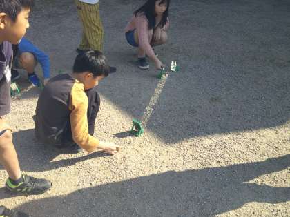 太陽の光を鏡ではね返し地面にはわせる実験をしました。子供たちは、鏡の当て方を考えるとうまく地面にはわせることができることに気付きました。