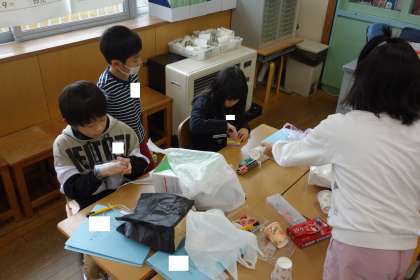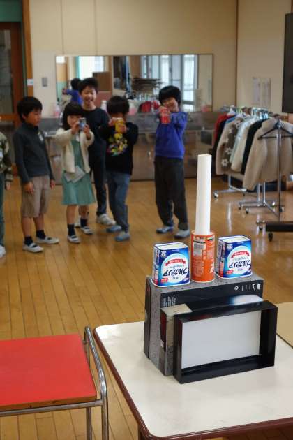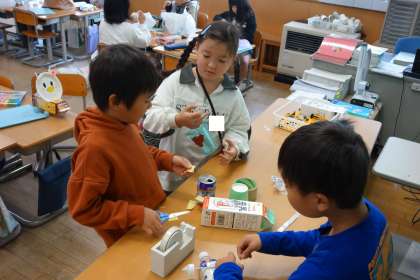 生活科のおもちゃづくりの様子です。遊びながら、改良したり、遊び方を工夫したりしています。