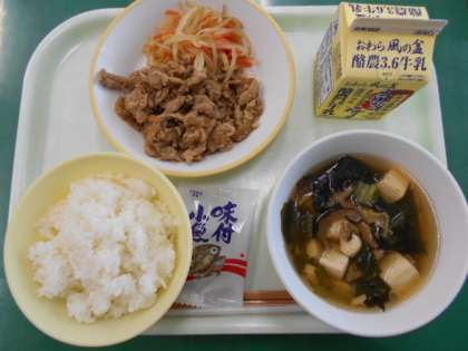 メニューは、ご飯、焼き肉、ナムル、中華スープ、味付け小魚、牛乳でした。