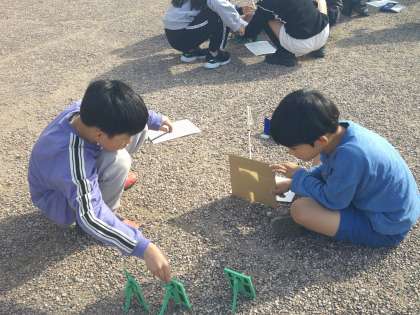 今回の実験は、日光を鏡で跳ね返した所はあたたまるかの実験をしました。鏡を1枚、2枚、3枚と増やして、温度が上がるかを調べました。鏡を増やすにつれ、明るさが増し、温度の上昇が見られると、「やっぱり。」とか「すごい。」などの声が聞かれました。