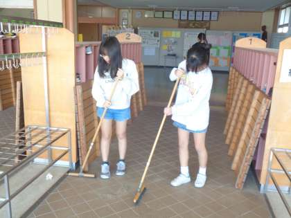 玄関の砂を減らしたいという思いで、一生懸命に掃除に取り組んでいます。掲示や放送の成果が出て減ってはいますが、安定して減らない状況に危機感をもち、呼びかけを行っています。今後も真剣に掃除をして、玄関だけでなく学校全てを綺麗にしていこうという気持ちが高まっています。