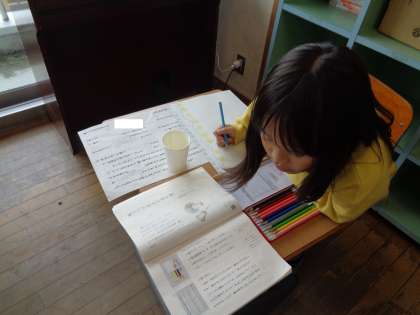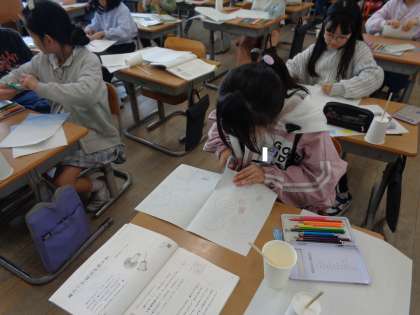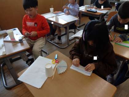 教科書の本文の内容や工夫を確認したあと、説明文に書いてある紙コップ花火を作ってみました。教科書の説明や写真をよく見ながら、手順に気をつけて作っている子供たちです。