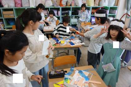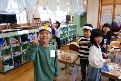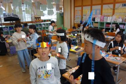 わっかにいろいろな飾り付けをし、体に身につけて変身!!友達と見せ合いながら、楽しく学習を行いました。
