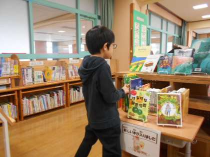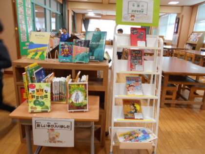 図書室に新しく入った本が並べられています。様々なジャンルを楽しんでくれるとうれしいです。