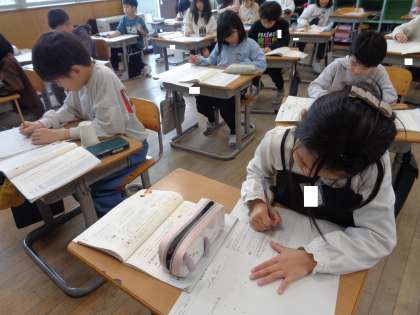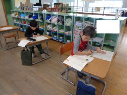 紙コップ花火の作り方の学習では、教科書に書いてあるお手本の説明文を見ながら、順序を表すキーワードに気をつけて、ワークシートを書きました。教科書を見ながら、真剣な表情で学習に取り組んでいます。