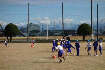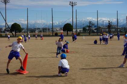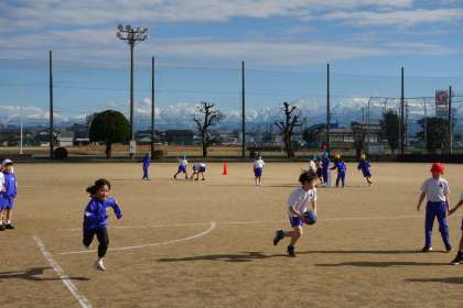 思い切りボールを蹴り、進塁します。たくさん得点が入れて、楽しく取り組むことができました。