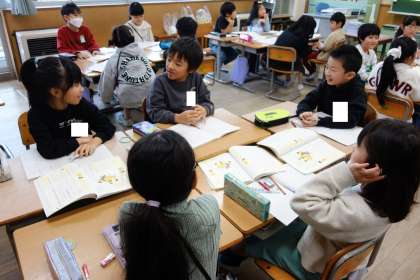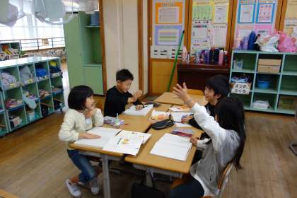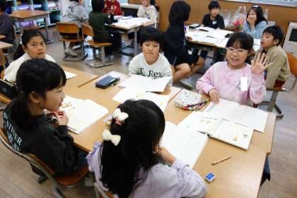 国語科の学習の様子です。一つの話題をもとに、グループで解決策を考えています。