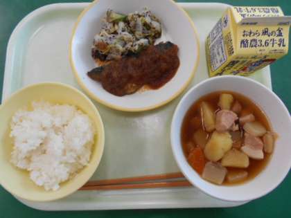 メニューは、ご飯、揚げ魚のみぞれだれ、ゆかり和え、豚肉とじゃがいもの南蛮煮、牛乳でした。