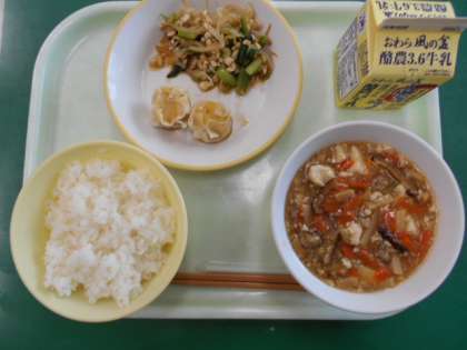 メニューは、ご飯、にんじんシューマイ、小松菜の大豆そぼろ和え、麻婆豆腐、牛乳でした。