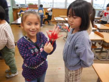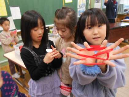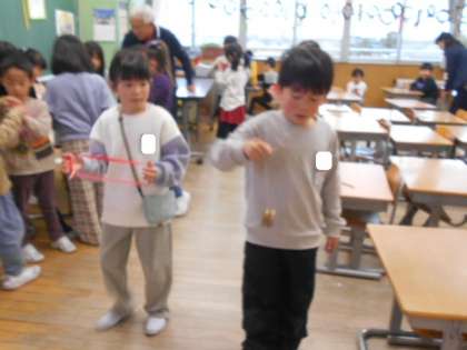 昔の遊びを体験しています。こつをつかみ、夢中になって遊んでいます。