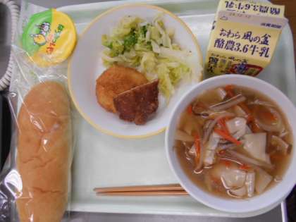 今日は選択献立です。メニューは、コッペパン、豚肉のこめこ揚げorえびカツ、添え野菜、ワンタンスープ、はちみつレモンゼリーor桃タルト、牛乳でした。