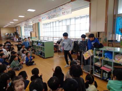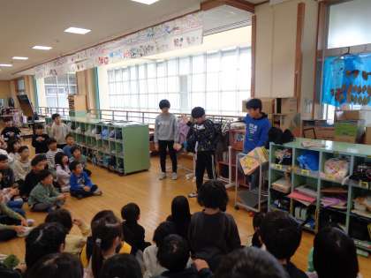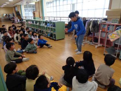 今、子供たちは休み時間に「昔の遊び」に挑戦いています。そこで、宮野っ子の先輩、名人に技を披露していただく機会を設けました。子供たちは、名人の技に目をまん丸くして見入っていました。