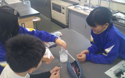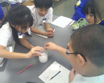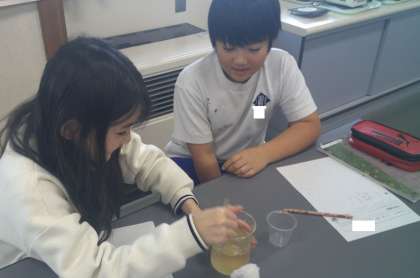 今日の理科の時間では、コーヒーシュガーと片栗粉を溶かし、その溶け方の違いについて観察しました。「片栗粉はだんだん下に沈んでいってる」「コーヒーシュガーは全体的に溶けているね」などよく観察し、友達と関わりながら学んでいました。