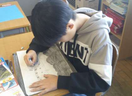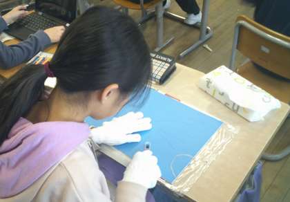 引き続き、図画工作科の様子です。下書きから上手に板に写すことができています。