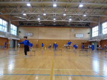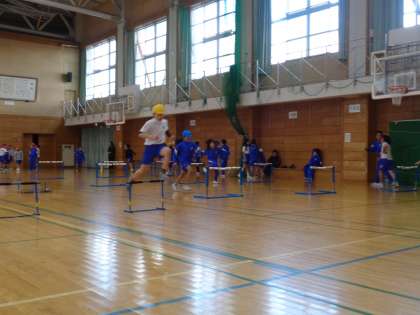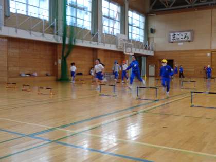 ハードル走をしました。後ろ足をスムーズに抜くことや、3歩のリズムで走ることを意識して、何度も練習に取り組みました。