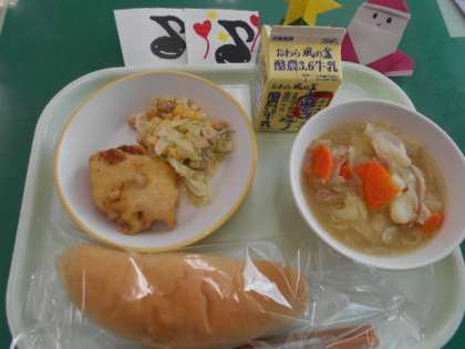 メニューは、コッペパン、ポークフリッター、ひよこ豆のサラダ、野菜のスープ煮、牛乳でした。