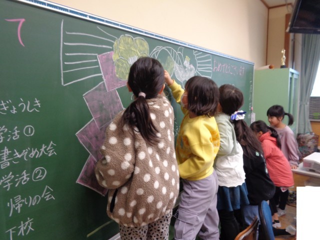3学期が始まりました。元気に登校した子供たちから「黒板メッセージの絵に色を塗りたい。」という声が。休み時間に好きな色を塗り、素敵な絵に仕上げてくれました。