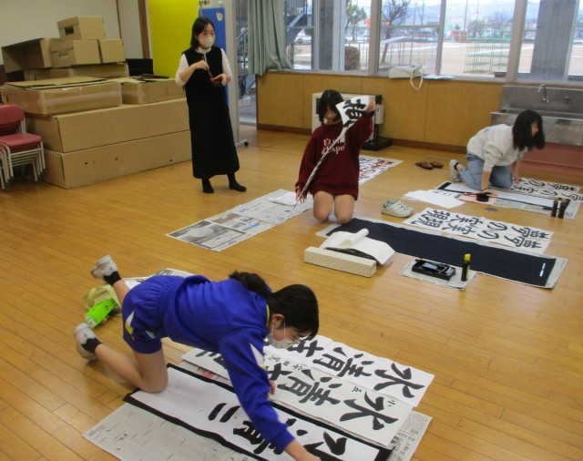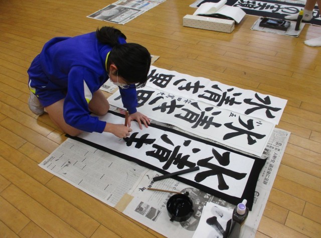 書初め大会の練習会を行いました。書写の先生をお招きし、丁寧に教えていただきました。代表児童は大会に向けてがんばっています。