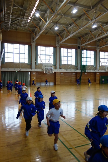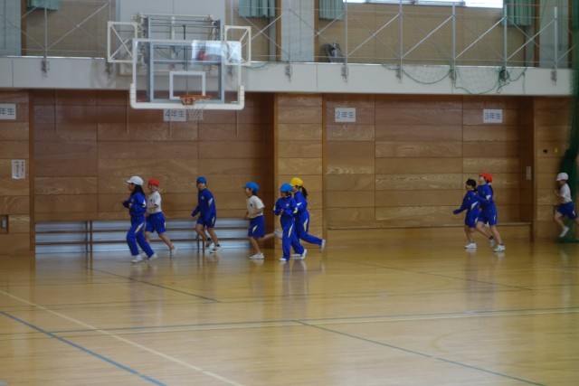 体育科の学習の様子です。ウォーミングアップに体育館フロアを何周も走ります。子供たちと確認したポイントは、「ゆっくり同じペースで」「手を振る」「前方を見る」、そして「歩かない」。最後まで歩かずに走りきる子供が多くいました。この取組を継続し、寒い冬ですが、体力づくりを進めていきます。