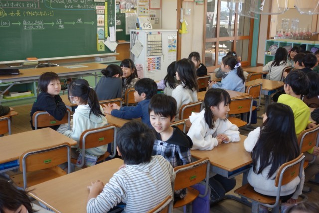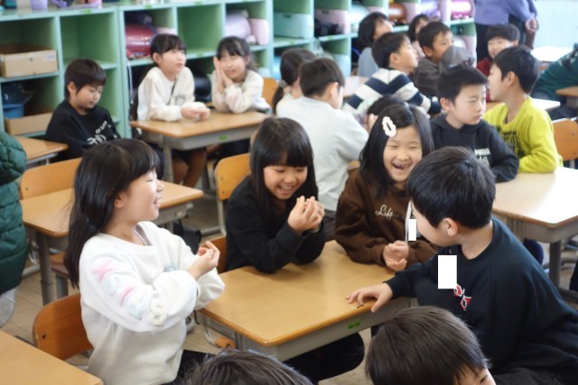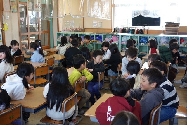 2年生は、3学期に「わたしたんけん」という学習を行います。今日は、学年みんなで学習の導入を実施しました。これまでの自分(たち)の様子を振り返り、友達と会話をしている様子です。