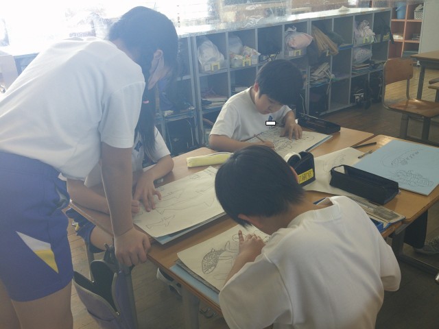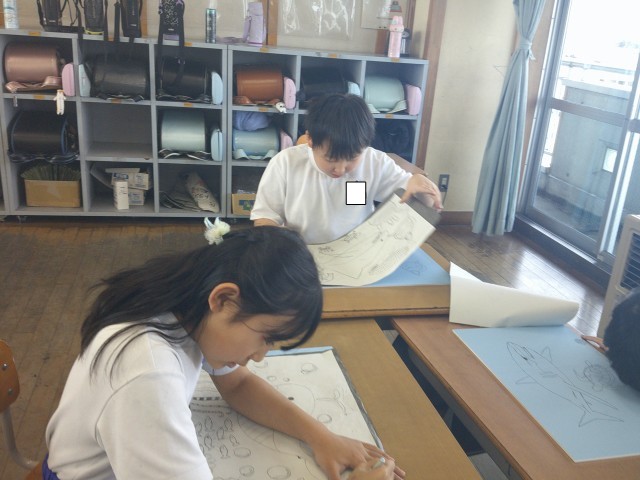 3年生 図画工作科 木版画の下絵を板に写しました