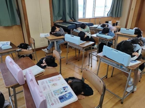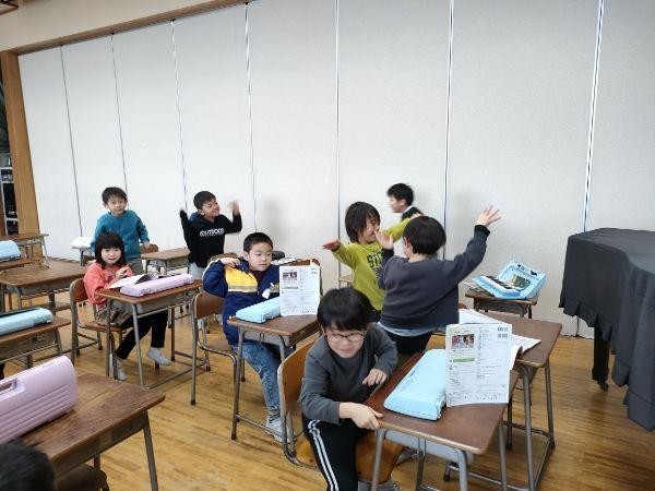 音楽科「ようすをおもいうかべよう」の学習では、「にんぎょうのゆめとめざめ」の音楽に合わせて、人形の動きを表現しました。子供たちは、様子が変わるところ(眠る・夢を見る・目覚める・踊る)を、曲の変化で感じ取りながら、体全体で表していました。