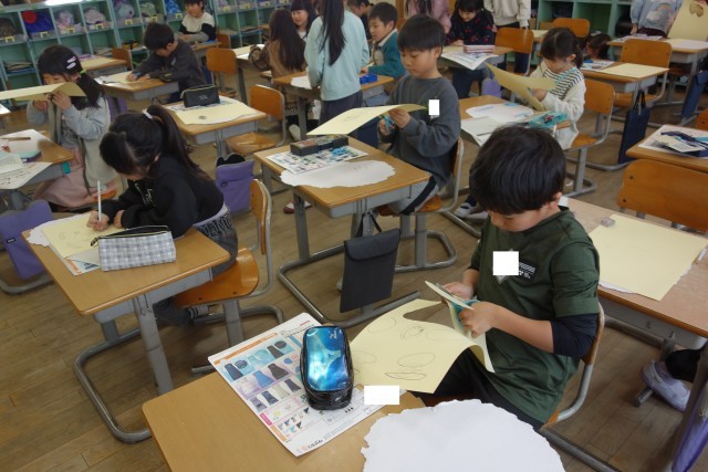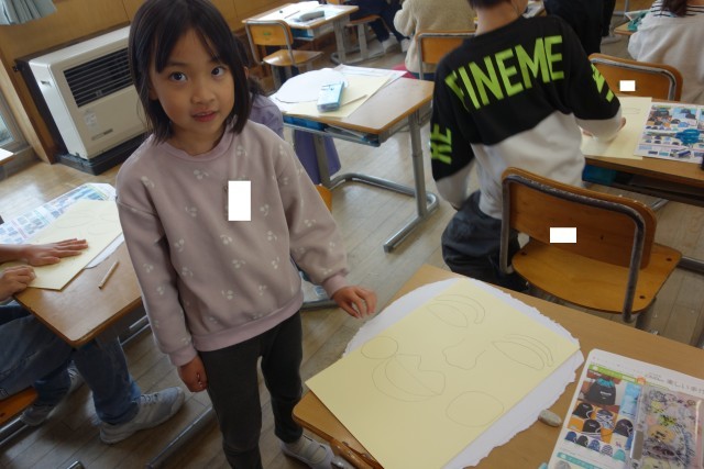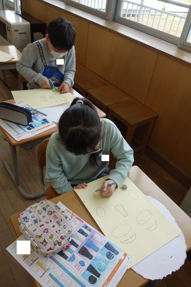図画工作科の版画の学習の様子です。目や鼻等、顔のパーツを作っている最中です。素敵な作品に仕上がりそうです。楽しみです。