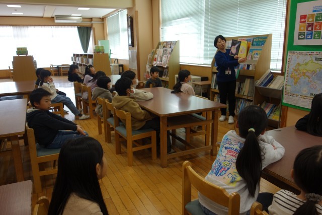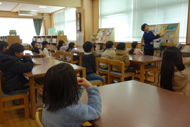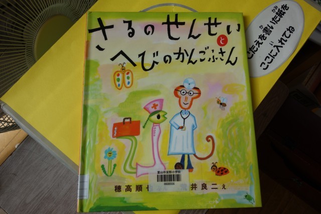 2025年は巳年。巳年にちなんで、司書の先生に「さるのせんせい へびのかんごふさん」という本の読み聞かせをしていただきました。