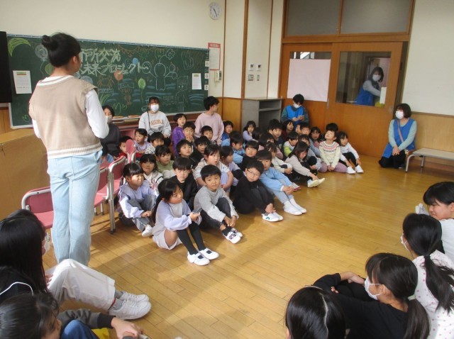 今回は、5年生が用意した紙芝居や劇、クイズ等を保育所のみんなに聞いてもらいました。