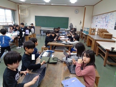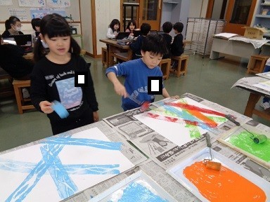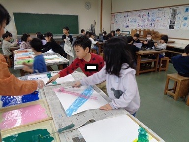 ステンシルローラー版画の下地を作りました。ローラーで思い思いの色を着色し、準備完了です。自分の番を待っている間、子供たちはスマイルネクストドリルで静かに自習です。この後、海の生き物を描いていきます。