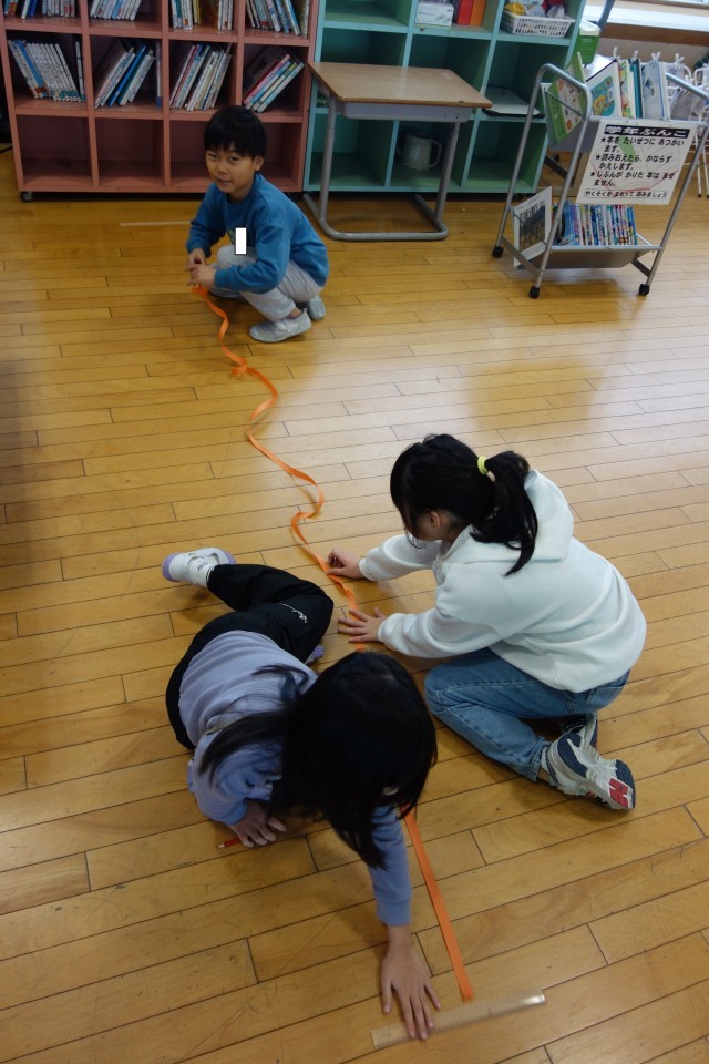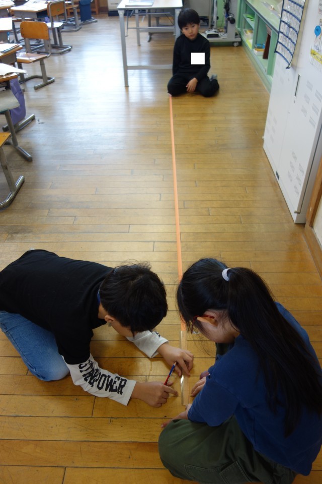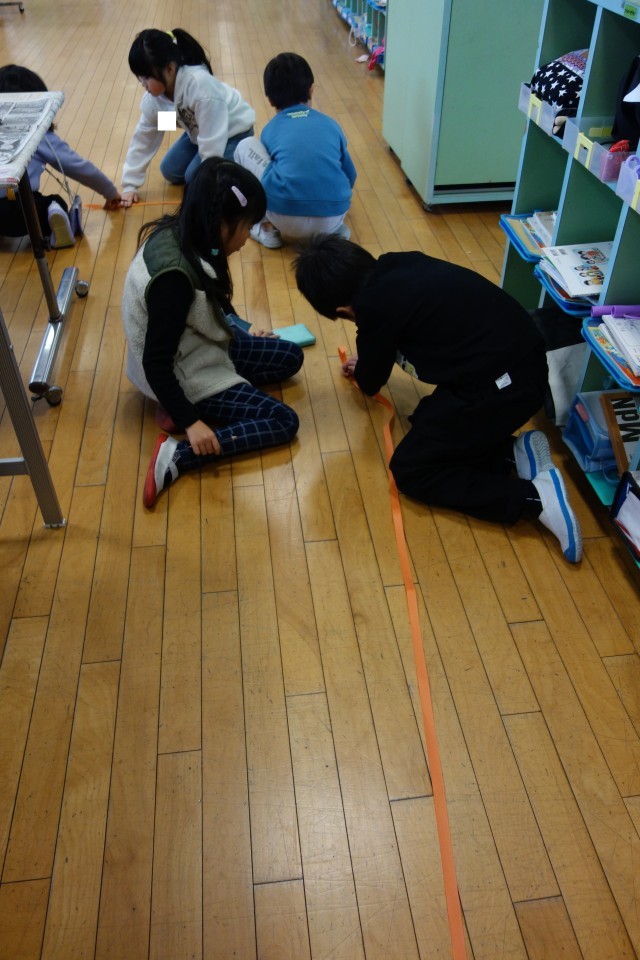 以前の学習で、1mよりも長いものがたくさんあることに気付いた子供たち。長い紙テープを使って、10cmごとに色鉛筆で目盛りを付け、長いものさしを作りました。