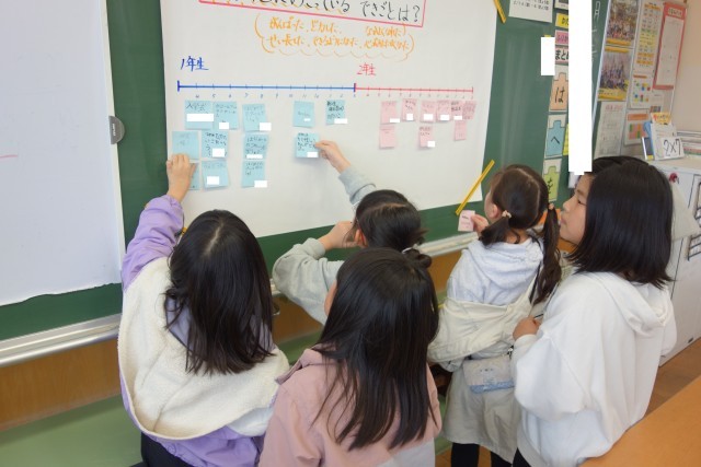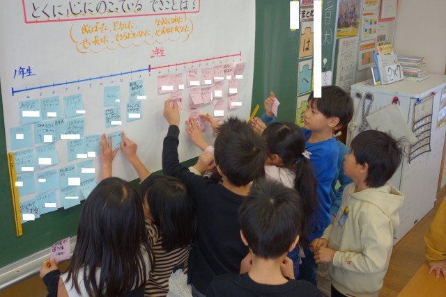 心に残った出来事を書き出し、年表にまとめてみました。付箋がたくさん貼られ、心に残る学習や行事がたくさんあったことが分かります。また、人それぞれ心に残った出来事も異なることも分かりました。