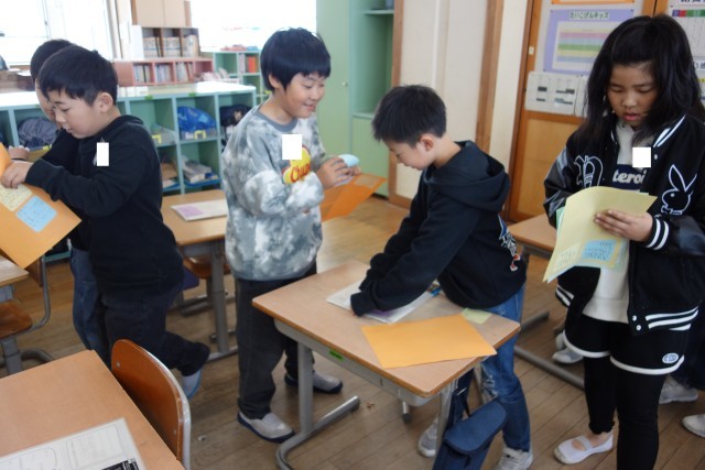 生活科の学習の様子です。友達の日々の様子やがんばりの様子を見て、温かいメッセージを送り合いました。メッセージを見て、笑顔の子供たちでした。
