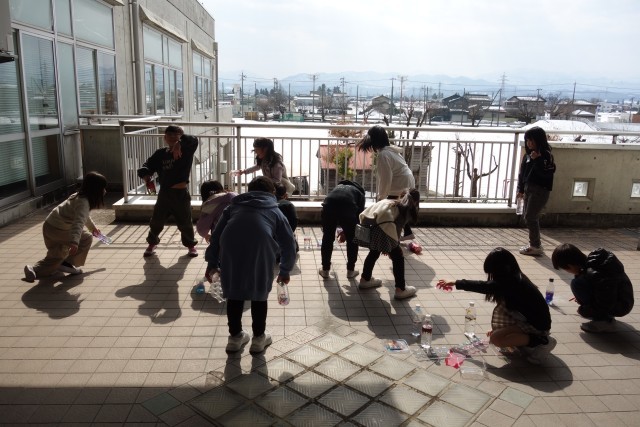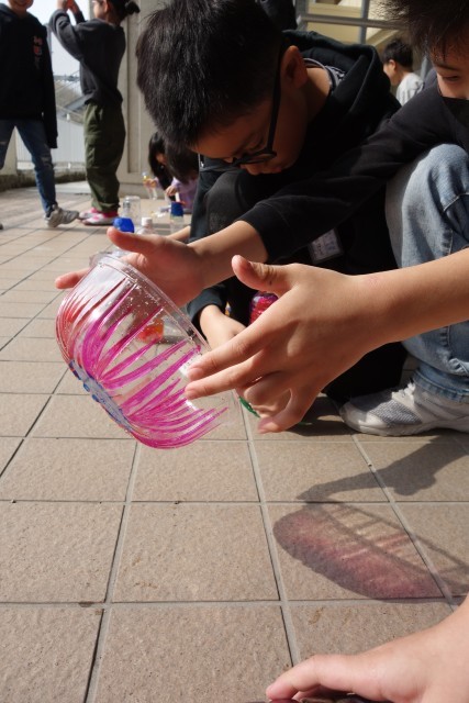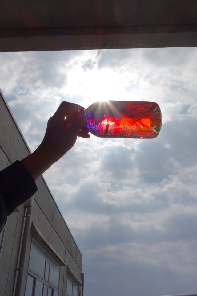 陽の当たる場所で、光を通してみます。子供たちの歓声が上がりました。