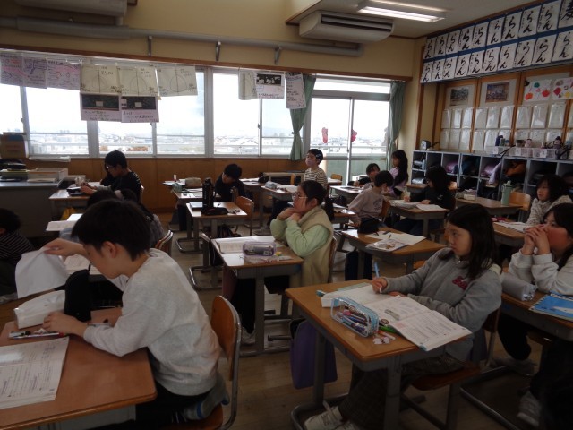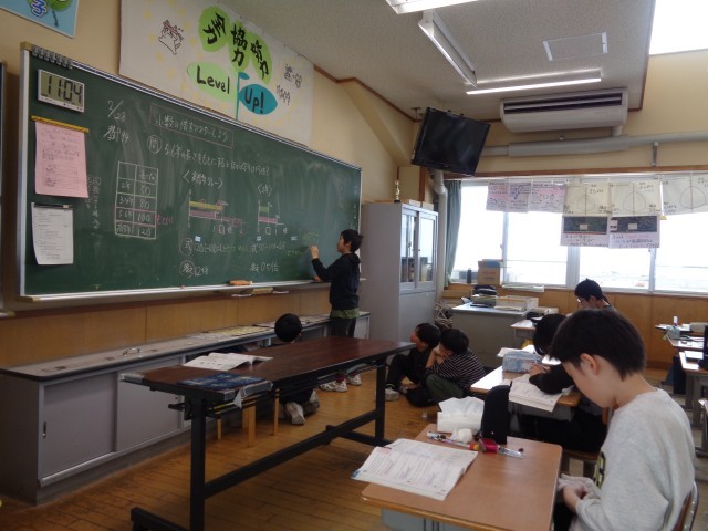 小数の倍について学習しています。友達と一緒に考えたり、発表を聞いたりして考えを深めています。